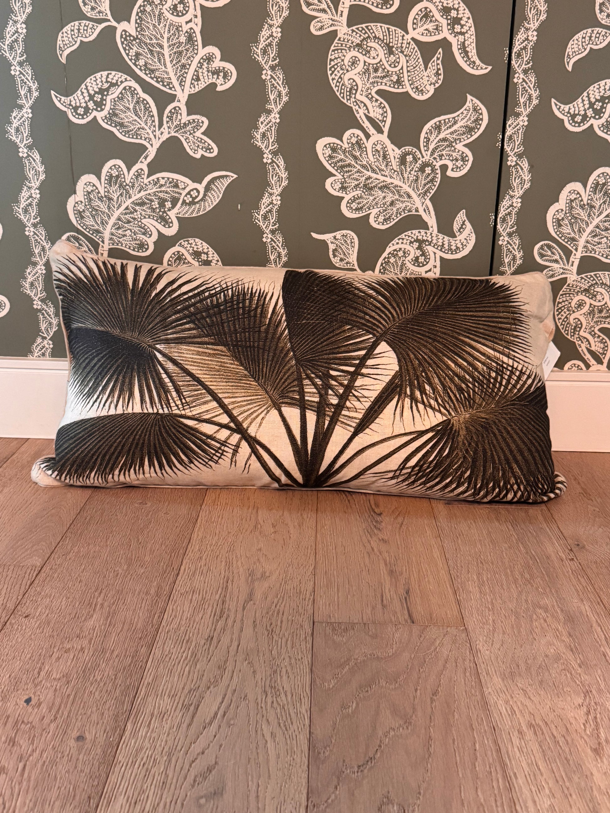 This 16 x 30 Neutral Palm Print Cotton Lumbar Pillow Cover offers a stylish touch to any living space. Made with low country dark neutrals, this generous-sized cover does not include an insert. Enhance your decor with this versatile and luxurious addition.